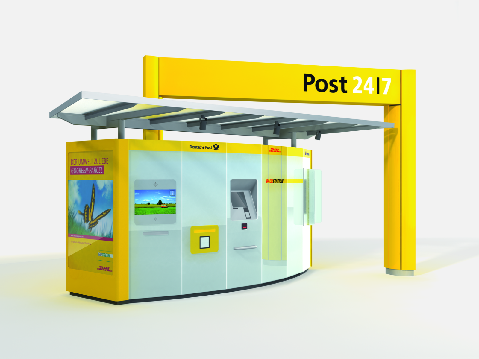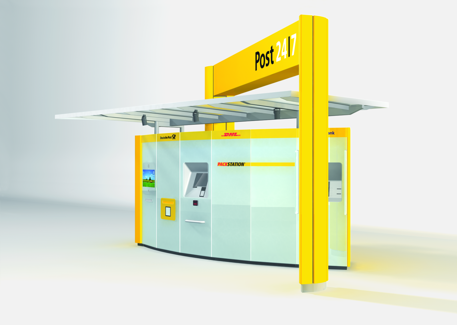 The Post 24|7 service terminal combines postal, package and financial services. Units such as a post box, a packet station, a stamp dispenser and an ATM will be integrated into a single service point and into a single easy-to-use GUI.